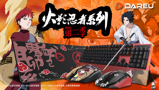 达尔优《火影忍者·疾风传》第二季的产品为达尔优EK815“我爱罗“版机械键盘,达尔优EM925”我爱罗“版游戏鼠标,达尔优LM120G”宇智波写轮眼“无线鼠标,”宇智波写轮眼“桌垫。