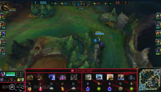 比赛前期,EDG猪妹入侵野区,结果被Snake三人包夹送出了一血。尽管Snake在上路有一点优势,但是EDG在下路对线击杀了寒冰,还拿到了一血塔,经济直接领先2000。