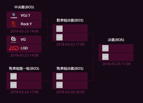 淘汰赛A组于21日结束,A组VGJ.T和LGD相对无悬念的晋级,但B组却爆出了不大不小的冷门,EHOME在被VG打入败者组后又负于ROCK.Y被淘汰,VG和ROCK.Y则携手出线。淘汰赛将采用双败赛制,首轮VGJ.T对阵ROCK.Y,LGD则将与VG强强对决。