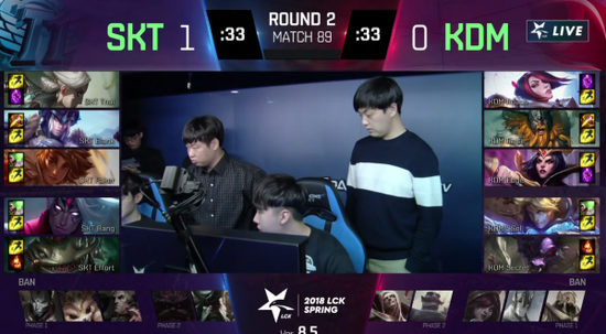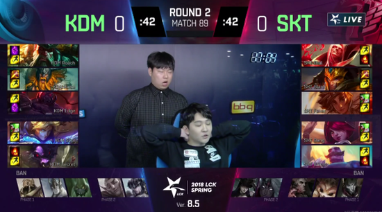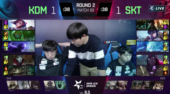 3月25日,LCK春季赛常规赛最后一天第一场比赛由SKT对战KDM,这场比赛只要SKT能赢就可以晋级季后赛,最终面对最后一名的KDM,SKT2-1赢下比赛晋级季后赛。