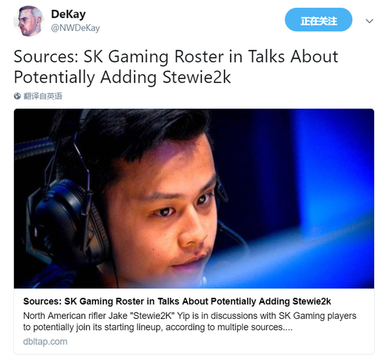 知名爆料人Dekay发文称,SK战队正在同stewie2K谈判,考虑其作为TACO离开后的替补人选。