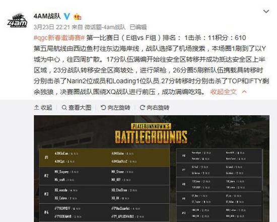 F组的4AM战队可以说是目前人气最高的战队,坐拥GodV、GuCun这样的全明星阵容,几乎每次大赛都能看到他们稳定而犀利的发挥,前一阵的乌克兰Sli联赛上,4AM面对欧美豪强以及国内并不擅长的FPP模式拿下二连鸡,成为唯一吃鸡的中国队伍,GuCun也以一把98k一狙成名,留下了两次1V3的高光表现,让人回味无穷。回归国内使用TPP模式的QGC新春邀请赛,4AM依然以其沉稳的发挥证明了他们是目前国内最全面的强队之一。