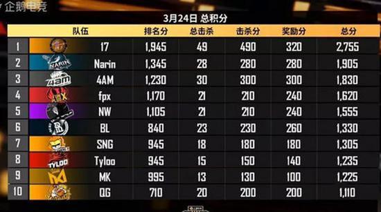在上周五与E组的战斗中,4AM在前几局虽然都有不少人头入账,然而强敌环伺,好几局连决赛圈都没摸到就被团灭,不过久经沙场的4AM显然心态调整的非常好,在最后一局中先是机智的“劝架”干掉了Narin和Loading战队,然后卡毒边无损团灭TOP战队,决赛圈面对占据中心点小木屋优势地形的XQ战队,4AM冷静的封烟摸近点,然后丢雷的同时左右拉开枪线,包围了XQ战队后无损将其团灭,最终神奇的满编吃鸡,4AM无可比拟的战术意识和执行力给所有人都留下了深刻的印象。在上周日面对G组诸强的时候,4AM在第四局把大局观发挥到了极致,多次依靠优秀的位置占点获得优势,最终17杀成功吃鸡,而这局之中GodV的狙击出神入化,一个人就击杀了八人,让人不得不佩服4AM个人实力的强大。而每天的比赛中4AM最终积分都是前三的成绩,确实是稳的可怕。