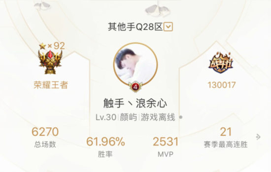 不过对于浪余心,大家可以了解一下:安卓手Q28区荣耀榜第一名,六印荣耀王者,九榜国服鲁班,还是国服孙尚香,在湖南省鲁班solo赛中成功拿下第一名,还是张家界王者荣耀杯冠军、王者荣耀主播星联赛四强,是公认的最强鲁班。