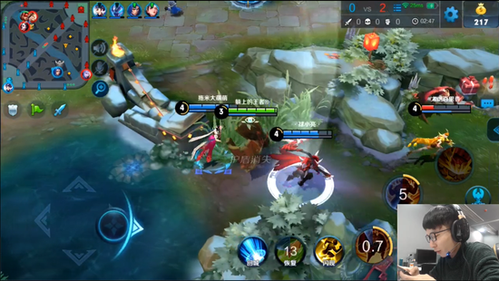 这局触手一笑选了廉颇,前期一直就在中路保护杨玉环。等到杨玉环升到4级,一笑带着两兄弟入侵对方野区,表示:“只要杨玉环有大招,对面就没人打得过我们!”