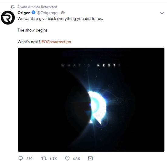 当地时间3月30日,Origen战队在社交网站发布信息,暗示将重返英雄联盟EULCS联赛。这条推文还得到了前皇家马德里后卫阿尔瓦罗·阿韦洛亚的转发。