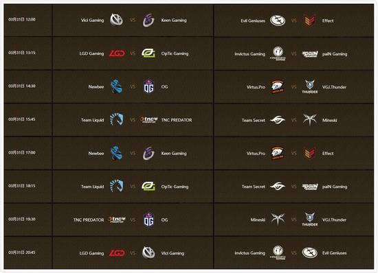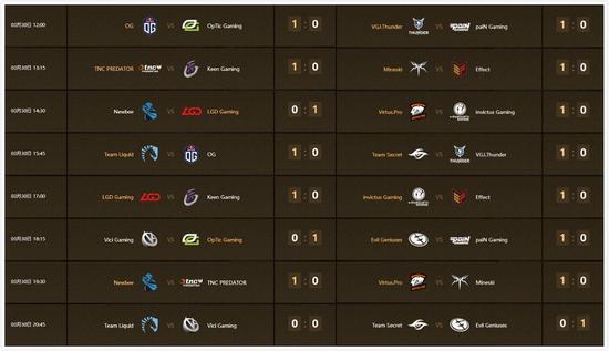 Liquid与OG的比赛中,OG选出天穹守望者,然而全队节奏全无,自己也没能获得发育空间,Liquid恐怖利刃和魅惑魔女输出爆炸带走比赛。VGJ.T与Secret苦战,Sylar祭出圣剑险些直接拿下比赛,却被Secret的刃甲限制了输出,最终被逆转,也是非常可惜。