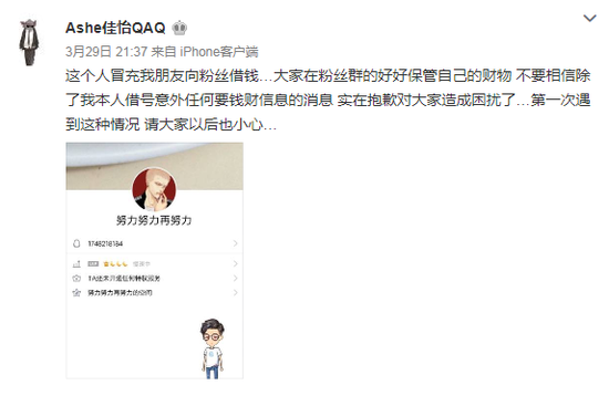 在面对如此棘手问题的情况下,Ashe佳怡当机立断,给两名受害粉丝各转账200元,以作为补偿, 并发微博进行提醒和安抚,呼吁粉丝小心谨慎,不要再上当受骗。