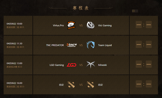 败者组第二轮,VG将于VP狭路相逢,他们期待着你的助威。而LGD将在胜者组决赛对阵Mineski,谁能率先进入总决赛?我们期待着悬念揭晓。