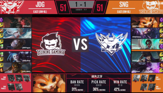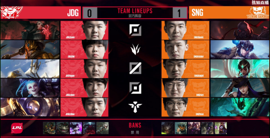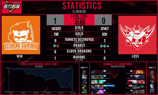 38分钟,双方远古巨龙处展开团战,JDG通过不断拉扯后拿下巨龙并打了一波1换1,不过之后想打大龙的时候被SNG找到一波机会接连击杀了上野后,SNG中路推进将基地打碎拿下第一局。