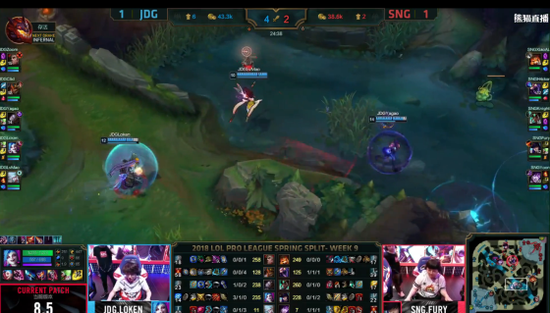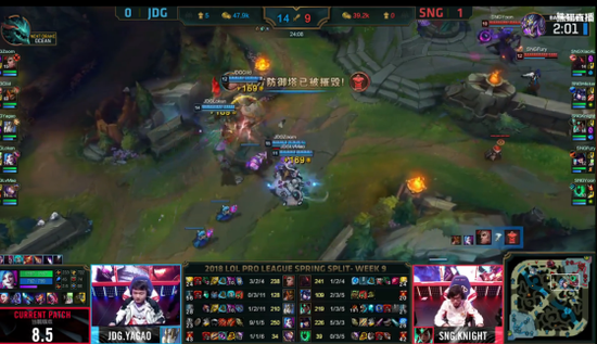 22分钟时,JDG利用机器人的钩子成功开团,最后打出一波团灭并拿下大龙,因为经济优势过大,SNG无力抵抗,JDG拿下了本局比赛。