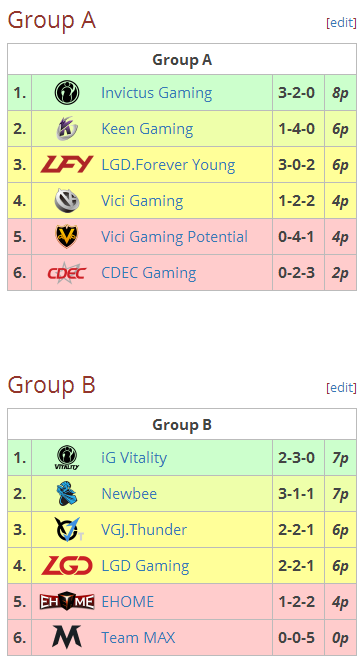 iG双雄无疑是本届DPL常规赛发挥最出彩的两支队伍。整个比赛周期他们就没有失去过各自小组头名的位置。iG战队在揭幕战中遭遇了VG.P战队的阻击,仅仅拿下一场平局,但此后他们就势不可挡,除了在3月22日没有啃下“牛皮糖”KG战队以外,其余场次他们均获得胜利,最终以3胜2平的不败战绩获得A组头名。iG.V不甘示弱,他们要比iG多一个平场,以2胜3平的战绩坐拥B组第一,两支队伍在季后赛中都获得了一个较好的顺位。