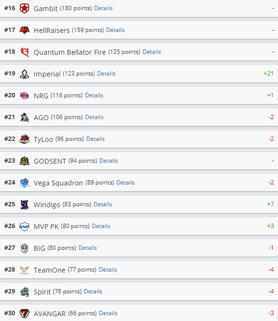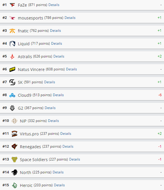 HLTV公布了CS:GO最新世界排名,SK Gaming滑落至第七位,C9排名第八,而第二名则是德国战队mousesports,第三名是瑞典战队fnatic。中国战队TyLoo目前世界排名第22位。