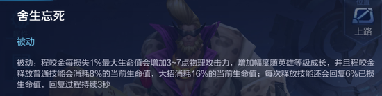 程咬金的技能特性决定了他独特的英雄强度。被动是程咬金的最大亮点,首先程咬金损失生命会增加一定的攻击力,这一特质让程咬金在对线期间的互相poke阶段变得十分恐怖,血越少越强,一个不小心就可能被他低血量的伤害打的生活不能自理。其次是生命消耗与生命回复,这样交互的特性让程咬金的持续作战大有保障,能打还能回,消耗越多回的越多,可以说单纯的被动就已经将程咬金铸就成了低血量怪物。简单粗暴的大招是程咬金最变态的作战技能,高减CD的支持下,程咬金的大招只有10几秒的无覆盖空间,这段时间回复上来的血量已经完全够用了。另一个程咬金的制胜伙伴就是不死鸟之眼,改版后的不死鸟之眼可以说是为程咬金量身定制,损失血量获得治疗量加成的设计让程咬金的发挥空间再度增强,同时平滑的合成和优秀的属性更是让程咬金如虎添翼。