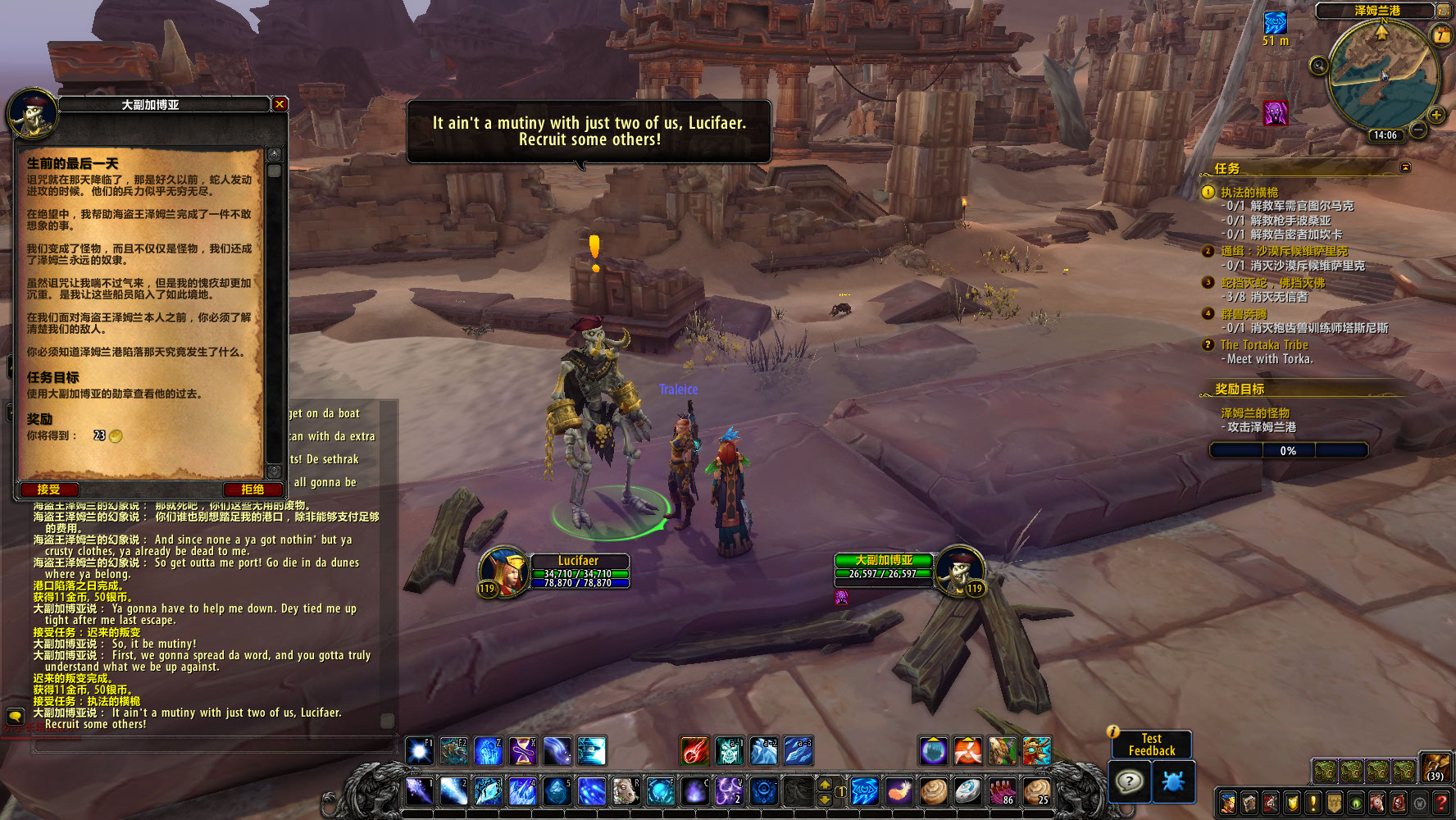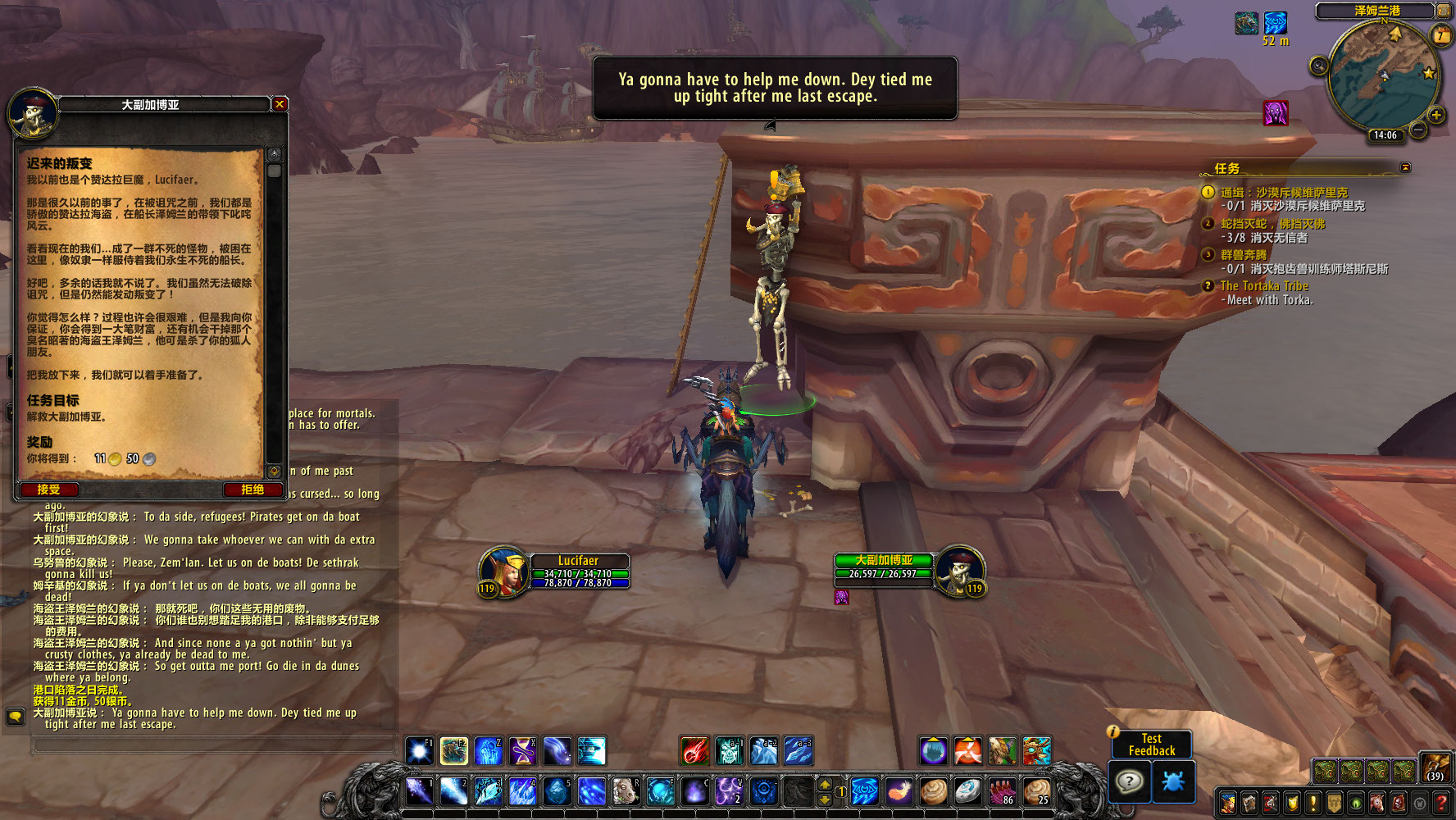 商队领袖诺莱说道,传说泽姆兰港的深处藏着一座宝山,藏着来自艾泽拉斯每一处角落的宝物。然而那里被不死的永恒怪物所看守。