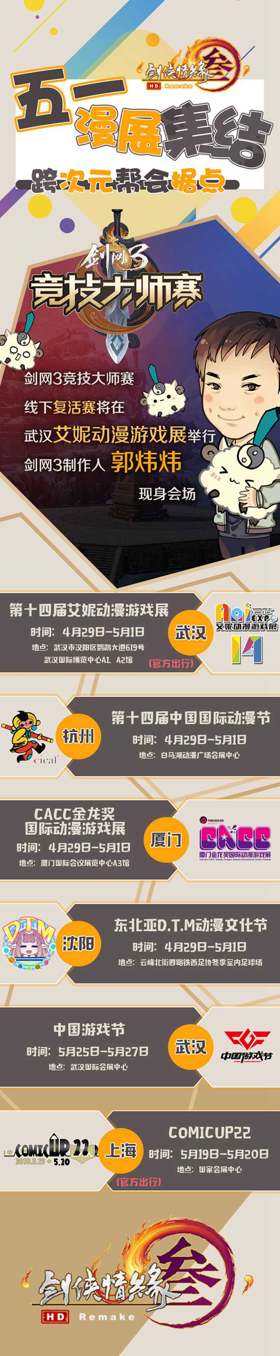 导语:《剑网3》五一漫展亲友集结大作战即将开启!全新聚会据点刷新,更有海量福利,神秘玩法等你探索!除了诸多漫展活动外,第三届《剑网3》竞技大师赛复活赛也将在武汉艾妮动漫游戏展进行!更有@剑网3制作人郭炜炜 现身会场,为侠士们亲自应援!