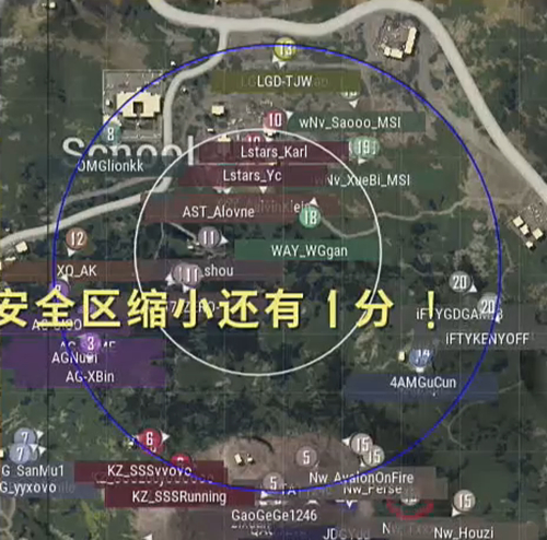 随着目前版本下更快的毒圈缩进,比赛很快来到最后几圈。安全区刷在了靠近学校拼图房附近。