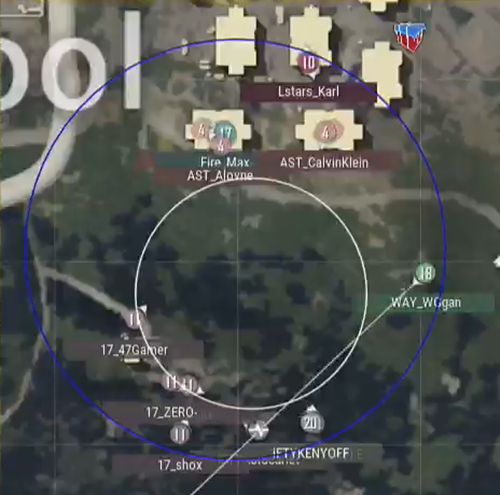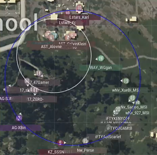 最终毒圈缩在学校东北方野外,KZsss早早占住中心点,而4AM也及时的卡住毒边。