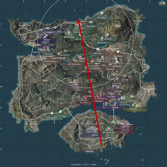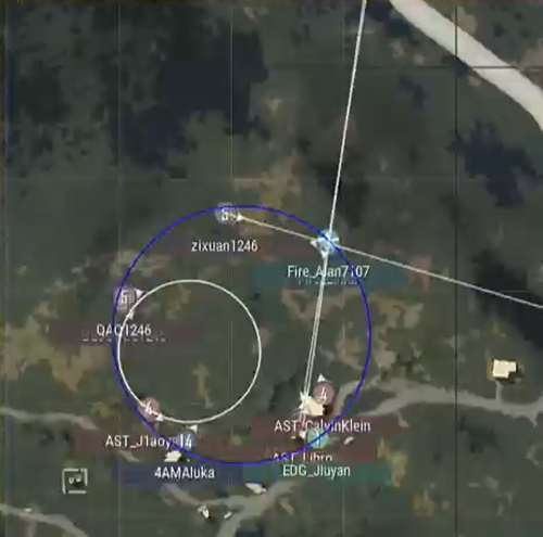 缩圈后,安全区出现在R城北边大陆,AST早早进圈占住中心点有利地形。