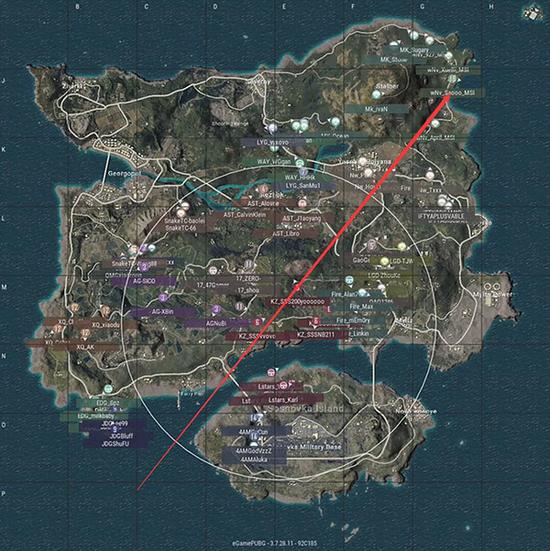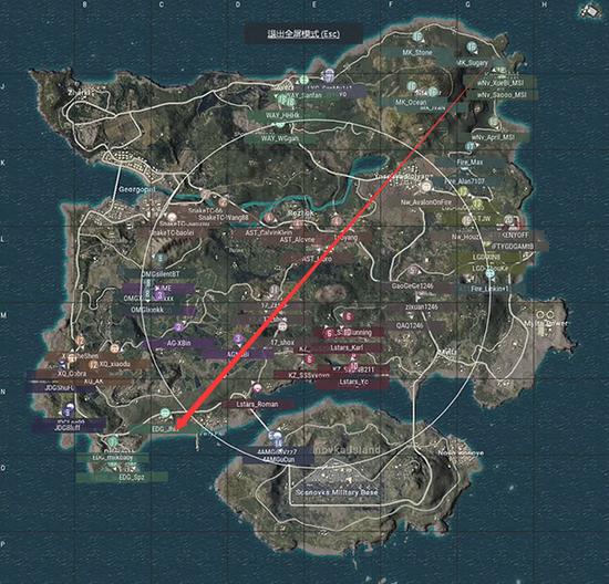 首场比赛的航线图如上,安全区则刷在了地图中央。17战队独占P城,LGD则和iFTY早早在L港外围相遇