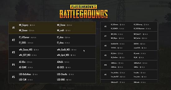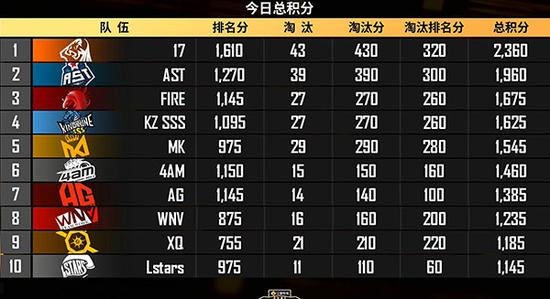 总结:在本日比赛中,17战队表现抢眼吃下2次鸡,牢牢占据积分榜首的位置: