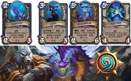 设计师Dean Ayala在访谈中,发布了部分支持机制的卡牌。比如黑猫……更超模版碧蓝幼龙了解一下,身材2.5费,法术伤害0.5费,战吼抽牌1.5费……碧蓝幼龙就强在泛用,这次的黑猫仅要3费,意味着可以打出各种Combo。至于其他新卡牌效果也不错,都能达到如此强度的话,新版本主推的奇数/偶数套路应该表现良好。