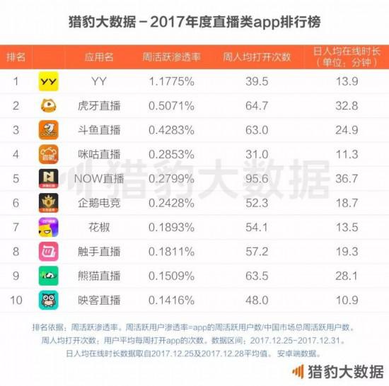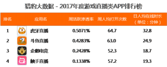 根据猎豹大数据的统计,虎牙直播周活跃渗透率为0.4747%,在所有直播平台中仅次于欢聚系的YY,而在游戏直播领域则稳居第一。与此同时,虎牙直播在周人均打开次数上达到63.8次,在游戏直播领域搞出第二名13个百分点。