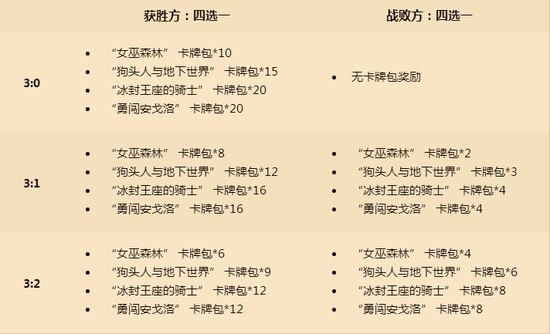 在每场BO5比赛后,根据不同的比分,每队的选手将可获得对应的卡牌包奖励(五选一),具体如下: