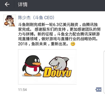 今年3月8日,斗鱼CEO陈少杰宣布,斗鱼刚刚完成了新一轮来自腾讯的6.3亿美元融资。至此,据公开数据统计,除了D轮未公布的融资金额之外,斗鱼的总融资金额已经超过了60亿元人民币。而同一天,与斗鱼同为直播行业巨头的虎牙直播也公布了一条获得腾讯4.6亿美元融资的新闻。
