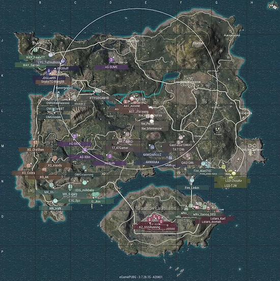 在近期的训练中,教练针对毒圈的新老变化给我们了传达了一些思路,在根据观察收集后由指挥来敲定行进路线及进圈的停靠点。我们觉得对圈的理解和判断是要建立在落伞时观察到的敌人方位,结合所处区域的资源点或行进路线综合得出一个大概的路线,当然,像“天命圈”这个怪东西,只是运气,毕竟运气也是实力的一部分。
