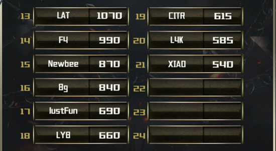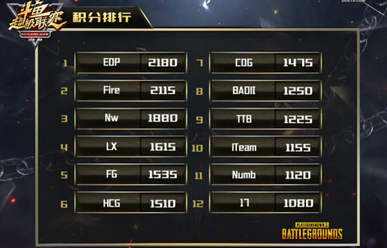 五局比赛全部结束后,EOP以2180的总分夺得冠军,Fire战队紧随其后,备受关注的17战队则排在第12位。
