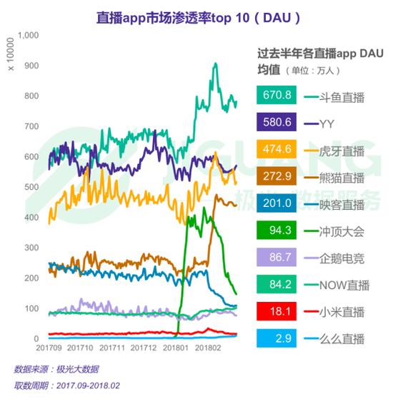 尽管前不久虎牙直播在美提交了上市申请,但是在行业估值上,斗鱼最大股东腾讯给出的斗鱼估值超24亿美元,远超虎牙13亿美元,斗鱼稳稳的成为行业领头羊;在平台活跃度上,斗鱼直播平台的每日在线活跃主播多达百万,在线观看人人数多达千万,也是很多平台可望而不可及的;而根据极光大数据最新统计,斗鱼直播过去半年的市场渗透率均值为670.8万,也远超排名第二的YY直播和虎牙直播。