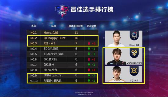 2018KPL春季常规赛已经过去一半了,各大战队的实力也展现得差不多了,其中表现最好的就是QG、Hero。久竞、XQ和RNG.M这四支队伍。