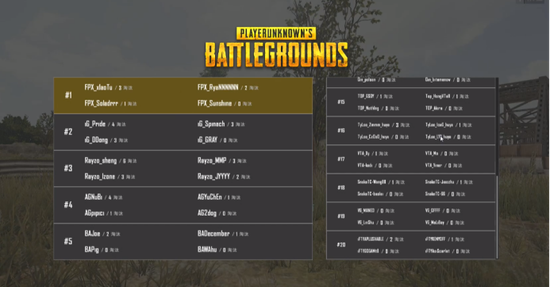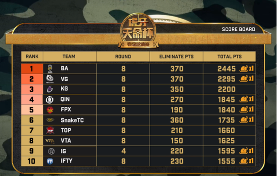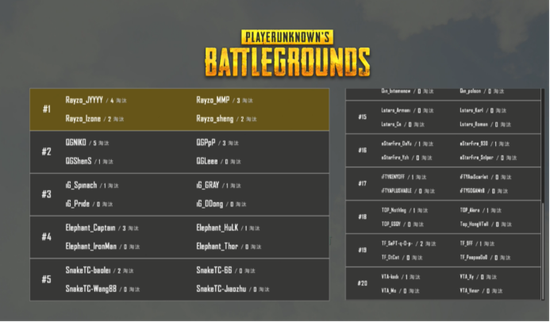 循环赛每天的第一场比赛都是表演赛,虽然不计算积分,但吃鸡的队伍可以获得一万块钱的奖金。吃一次鸡就能获得一万块奖金的诱惑也让AE组的队伍在进行表演赛的时候依然保持着高水准,A+带领的IFTY战队在前期变遭受到了对手的狙击,成为了第二只在表演赛被淘汰的队伍。值得一提的是,昨天表演赛表现不好的IFTY在正赛也是爆发出了强大的实力。最终,经过决赛圈的较量,Rayzo战队拿到了11个击杀,同时也收获了天命杯循环赛的第二个万元大奖。