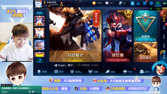 说起KPL,有一种信仰叫AS仙阁,说起仙阁不得不说的一位选手就是辰鬼。辰鬼早在4月27日就发布微博,宣布自己即将在企鹅电竞开启首播,5月1日当日辰鬼与职业选手一起五排开黑,抢先体验了“五五开黑节”带来的快乐时光,首播期间还送出了iphone8、ipad、现金红包等礼物。直播开始辰鬼直播间的人气不断飙升,峰值更是一口气突破了400万人气大关,顺利拿下企鹅电竞单日人气、礼物双榜冠军!