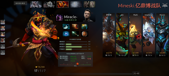 其余四场外战中,Pain以二比零的比分击败Navi,多少出乎了我们的预料。而在具体的比赛中,hFn的露娜则给观众留下了非常深刻的印象。首局比赛,前期经济全方位落后,就是靠着这手露娜,Pain才在正面获得了喘息的机会。16分钟的肉山团战,在亚巴顿阵亡的情况下,露娜配合SK的控制打满输出,将水人、大鱼人和火女悉数击杀。之后的残局,虽然不朽盾被Dendi拿到,但买活的火女则再次被露娜击杀。第二局,hFn的露娜在结束的时候达成了9-0-11的恐怖数据。看来打Navi这样节奏散漫的队伍,露娜确实是一个不讲道理的英雄。