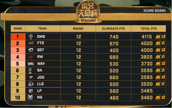二连鸡的OMG战队并没有继续他们航海王的称号,而是被安全区困在了海岸线以外阵亡,算是完成了一波吃鸡队伍“反向吃鸡也许会迟到,但永远不会吃鸡”的诅咒。而在第三个圈便占据了圈内防空洞位置的FTD战队开始了打靶,在决赛圈保持满编的FTD面对同样满编的QM战队时手握安全区优势,而JTeam的独狼也给QM捅了一刀,最终FTD在拿下15杀的情况下成功吃鸡。