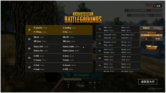 安全区最终刷新到了加油站外的平原,由于毫无树木作为掩体,大量队伍在进圈过程中被团灭。此时场上还有3队9人。VC两人率先向LP发起冲锋,可惜LP借助车辆作为掩体,LP以一人的代价换掉VC两人。VC最后一人也不再等候,先补掉ELEPHANT倒地的人之后企图冲击LP,LP沉着冷静将其击杀,ELEPHANT最后一人被LP队员一枪AWM带走,LP成功吃鸡。