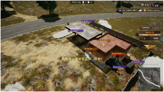 比赛进行到22分钟,HG上演精彩攻防战。在中心刷到加油站以后,HG果断决定攻楼。借助烟雾接近加油站后,HG四人枪线拉开,成功包围GLORY并将其团灭。