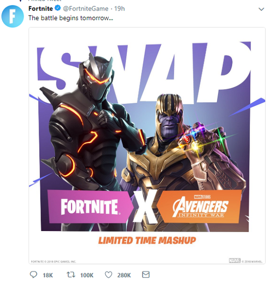 5月8日,堡垒之夜宣布将和《复仇者联盟3:无限战争》展开联动,大Boss灭霸即将在堡垒之夜游戏中登场!