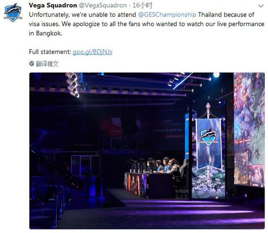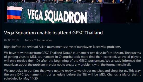 Vega方面解释称:在这次亚洲之行前他们的一些队员遭遇了签证问题,因为办理参加长沙Major的中国签证花去了比他们预期多得多的时间,所以部分队员在泰国Minor开始后才能收到他们的护照,所以他们不得不有所取舍放弃泰国的比赛。对于准备看他们比赛的观众和粉丝表示道歉。