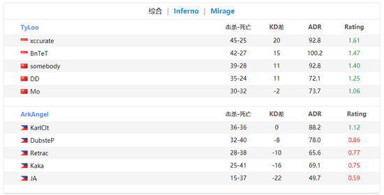 第二张图来到Mirage,进攻方的TYLOO状态火热多点开花,上半场定格在13:2,下半场ArkAngel奋起反击打出一波5:1,关键时刻Xcc站出来连狙4人稳住局势,TYLOO最终以16:8终结比赛