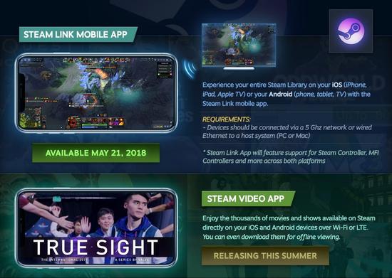 Steam Link预计将于5月21日上线,该APP允许玩家通过串流自己安卓终端(手机、平板、电视)和IOS终端(iPhone、iPad、Apple TV)使用自己库存内的服务(游戏等),未来Steam也将支持Steam 手柄,MFI认证手柄。串流连接需要5GHZ无限网络或者有线网络的支持,掌上DOTA2不是梦?