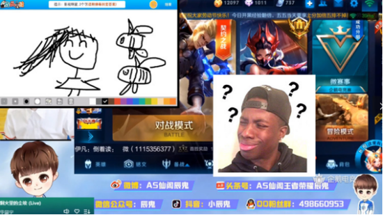 随后,通过翻看辰鬼前几日的直播录像,也是找到了他在直播间与观众玩“你画我猜”的视频,其中最后一道题“猜影视明星”的题目正也是杨幂,而辰鬼绘画的则是小女孩+蜜蜂,你当真不怕幂姐打死你嘛233?