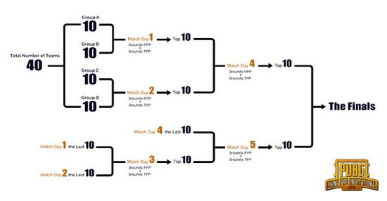 本次参赛战队名单综合了2018年1月至4月间7个官方授权赛事的成绩进行甄选,40支战队将通过预选赛决出20强,进入为期4天的决赛。预选赛时间为5月25日~29日,以10支战队为单位分组,采用双败赛制的方式进行,预选赛将平均分配TPP与FPP模式,每天每种模式各进行3场,每日共6场比赛。