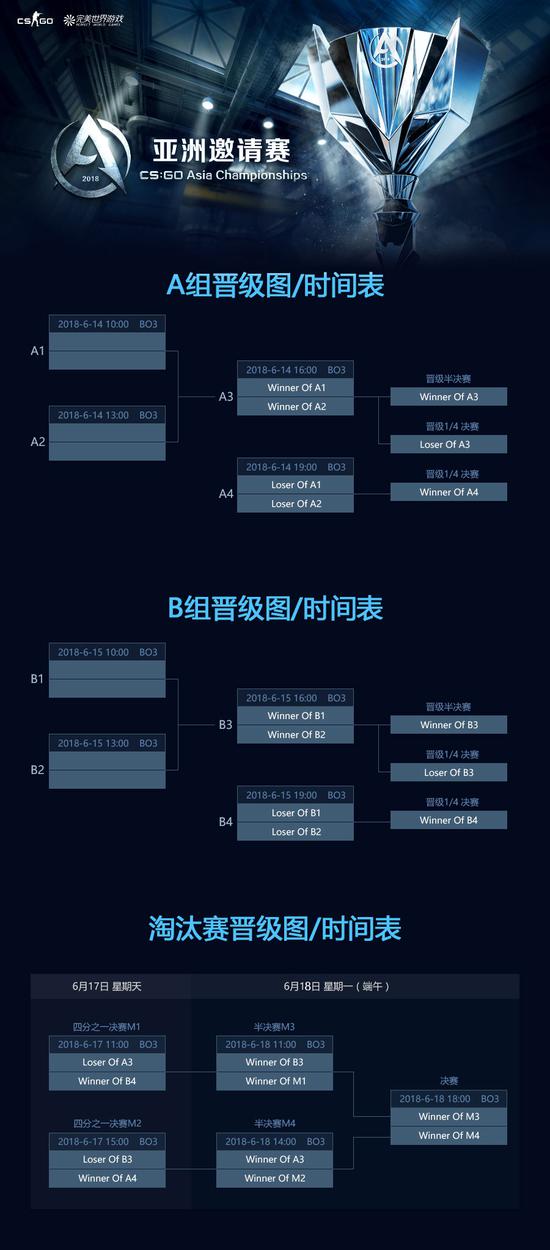 CS:GO亚洲邀请赛正赛的8支战队将分为A、B两组。小组赛将采用BO3双败淘汰制,2支胜者组冠军队伍率先晋级半决赛。两组的胜者组败者和败者组胜者晋级四分之一决赛,他们的胜者将晋级半决赛。半决赛起将采用BO3单败淘汰制,角逐出最终冠军。