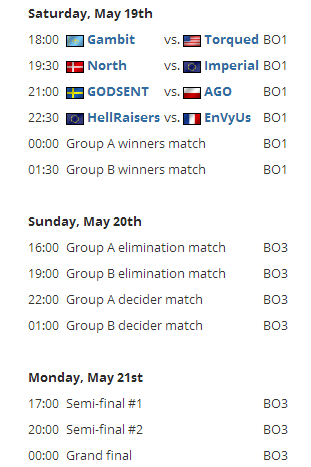 本次比赛小组赛为BO1的GSL赛制,淘汰赛为单败BO3赛制,每组前2将晋级第三日的半决赛。此次比赛将于本周六(5月19日)开始,周六周日将进行小组赛决出四强,在下周一(5月21日),将会进行最后的半决赛和决赛。完整赛程如下: