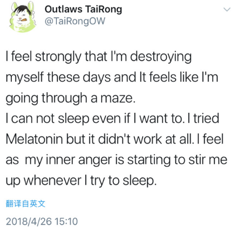 更早之前,休斯顿神枪手队主教练 Tairong 发推表示自己面对了巨大的压力,直接导致长时间睡眠质量低下。