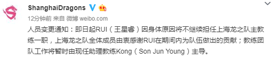 昨天中午,上海龙之队官方发布人员变动通知,即日起 RUI(王星睿)因身体原因将不继续担任上海龙之队主教练一职,教练团队工作将暂时由现任助理教练 Kong(Son Jun Young)主导。
