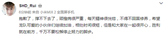 RUI 发博表示自己的身体确实出现了非常严重的健康问题:“抱歉了,撑不下去了,颈椎病很严重,每天精神很恍惚,不得不回国修养,希望龙队可爱的小伙伴们继续加油,相处时间很短,但是和大家在一起很开心,胜利就在前方,千万不要松懈停止努力的脚步。”